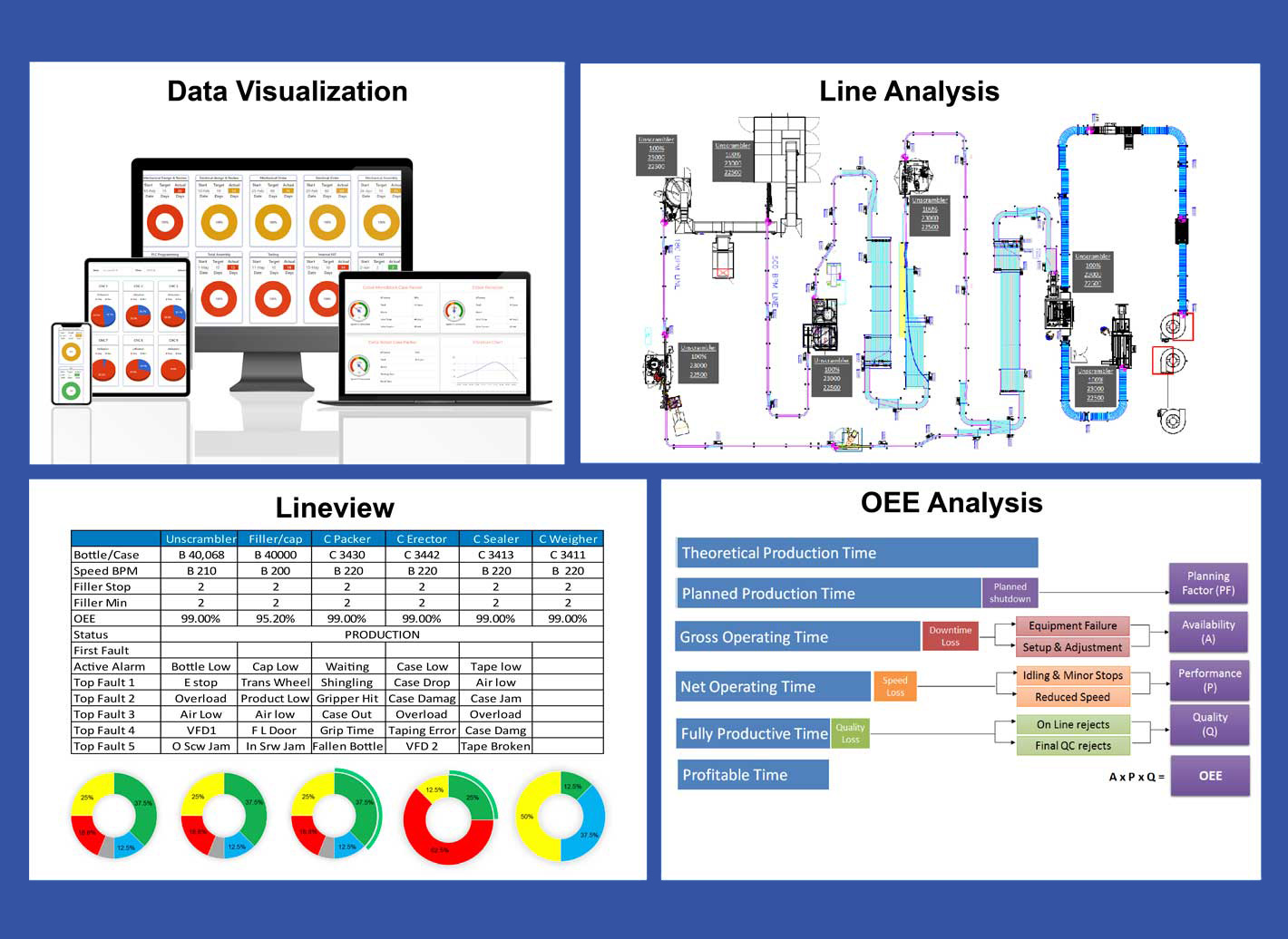 Performance status of machines and other KPIs can be viewed real-time on specific users device ( laptop, mobile, tablet ) through graphical representations on our Web /Android / IOS applications